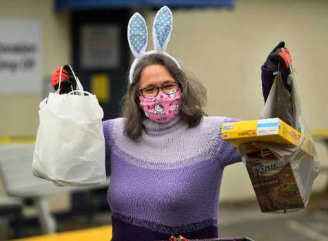 Decked out in festive Easter Bunny ears, Remy Kocurek, director of St. Vincent DePaul of the Valley, collects food donations at the food pantry at 237 Roosevelt Drive in Derby, Conn. on Sunday, April 5, 2020. The pantry has been accepting new clients in the wake of the coronavirus pandemic.
